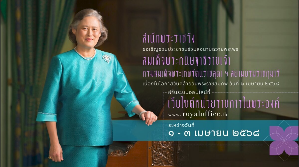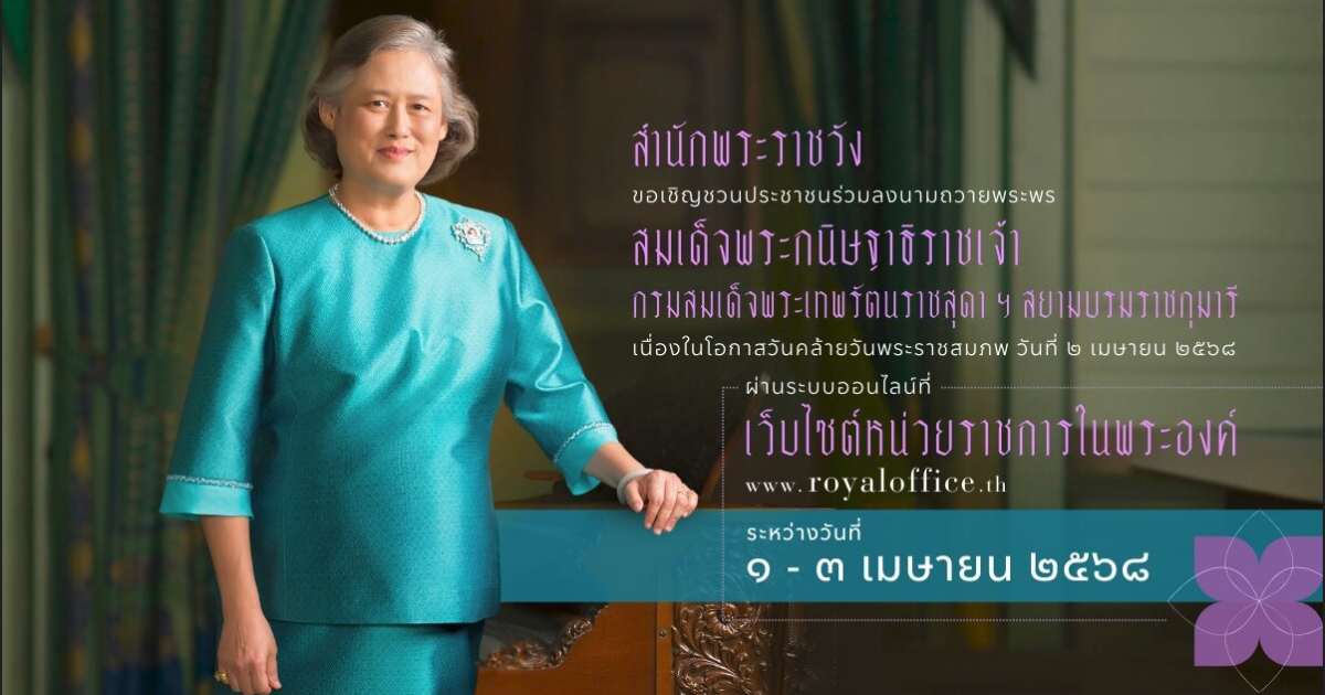 สำนักพระราชวัง ขอเชิญชวนประชาชนร่วมลงนามถวายพระพร สมเด็จพระกนิษฐาธิราชเจ้า กรมสมเด็จพระเทพรัตนราชสุดา เจ้าฟ้ามหาจักรีสิรินธร มหาวชิราลงกรณวรราชภักดี สิริกิจการิณีพีรยพัฒน รัฐสีมาคุณากรปิยชาติ สยามบรมราชกุมารี เนื่องในโอกาสวันคล้ายวันพระราชสมภพ วันที่ ๒ เมษายน ๒๕๖๘