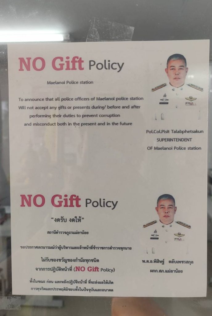 ประกาศ สถานีตำรวจภูธรแม่ลาน้อย เรื่อง เจตนารมณ์ที่จะไม่รับของขวัญและของกำนัลทุกชนิดจากการปฏิบัติหน้าที่ (No Gift Policy)